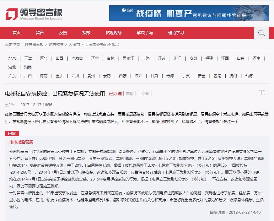感謝您留言,收到您的留言后委領(lǐng)導(dǎo)十分重視,立即責(zé)成職能部門調(diào)查處理。經(jīng)核實(shí),萬華里小區(qū)的物業(yè)管理單位為天津華廈物業(yè)管理發(fā)展有限公司第一分公司,名下共計(jì)60部電梯,分為一期和二期,其中一期12部,二期48部。一期的12部電梯于2013年加裝梯控,并于2015年啟用梯控系統(tǒng);二期的48部電梯2014年安裝時(shí)帶有梯控系統(tǒng),并于2015年啟用梯控系統(tǒng)。根據(jù)《質(zhì)檢總局關(guān)于印發(fā)<電梯施工類別劃分表>(修訂版)的通知》(國(guó)質(zhì)檢特[2014]260號(hào)),2014年7月1日之后辦理電梯安裝、改造和修理告知的,應(yīng)當(dāng)符合修訂后的《電梯施工類別劃分表》(修訂版)。而萬華里小區(qū)的電梯,均在2014年7月1日之前完成了梯控系統(tǒng)的安裝,2015年啟用梯控系統(tǒng)的行為,根據(jù)《電梯施工類別劃分表》(修訂版),不在安裝、改造和修理范圍內(nèi),因此不需要辦理施工告知。
