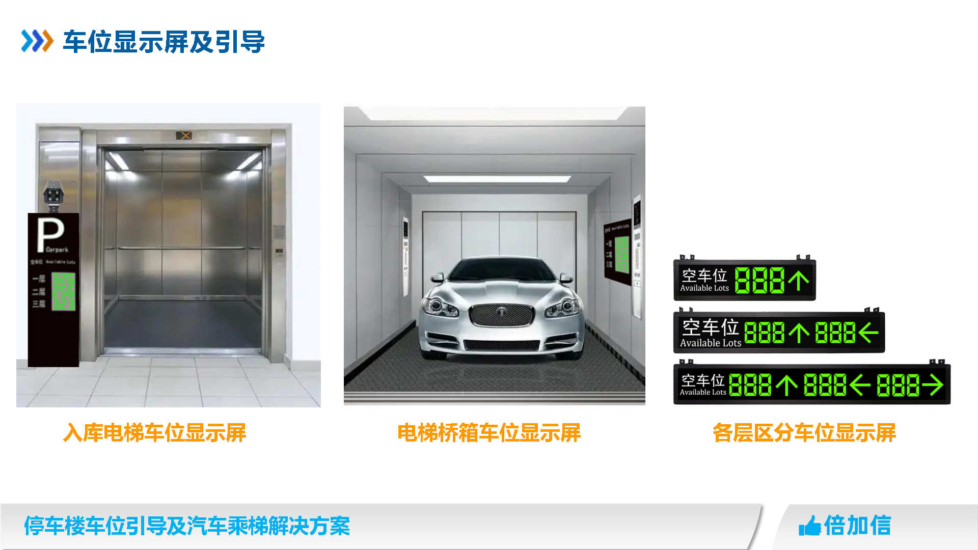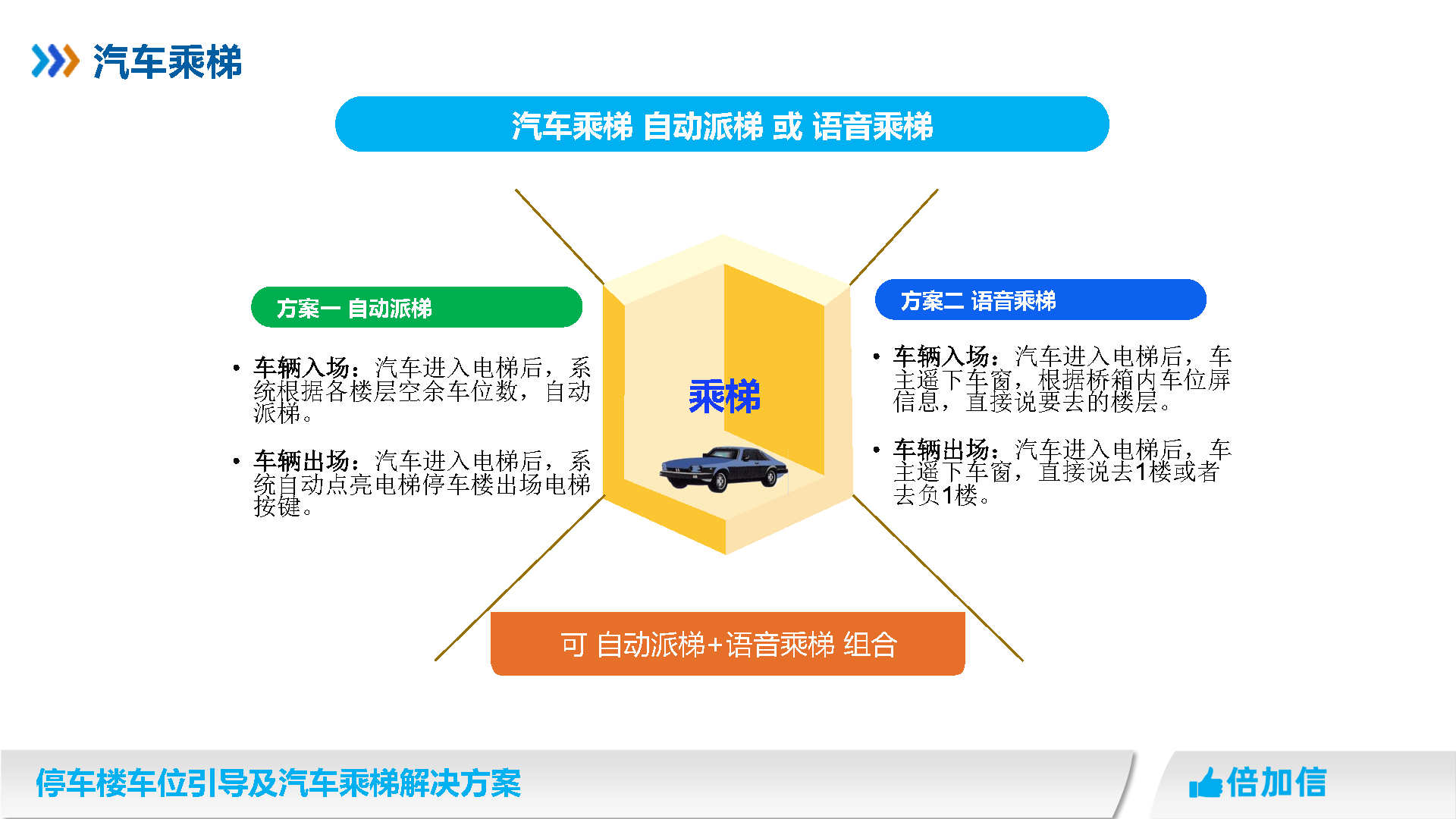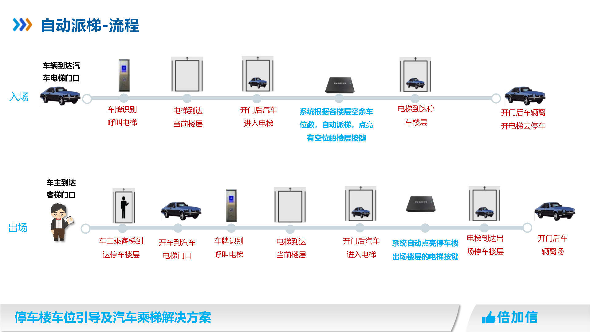 倍加信汽車乘梯系統(tǒng)方案優(yōu)勢(shì) 1、通過視頻/超聲波/地磁,實(shí)時(shí)獲取停車樓各樓層空余車位數(shù)/ 2、入庫(kù)電梯屏、電梯橋箱屏、分區(qū)引導(dǎo)屏實(shí)時(shí)引導(dǎo)車主停車 3、車牌識(shí)別自動(dòng)呼叫電梯到達(dá)當(dāng)前樓層,包括入場(chǎng)乘梯和離場(chǎng)乘梯 4、不需要電梯提供協(xié)議,汽車派梯系統(tǒng)可自動(dòng)根據(jù)各樓層空余車位數(shù),自動(dòng)派梯 5、不需要電梯提供協(xié)議,可實(shí)時(shí)獲取電梯當(dāng)前?繕菍印㈦娞萆舷滦袪顟B(tài)、開關(guān)門狀態(tài) 6、不需要電梯提供協(xié)議,可語(yǔ)音識(shí)別招梯和乘梯,包括客梯也可以語(yǔ)音乘梯 7、不需要電梯提供協(xié)議,可實(shí)現(xiàn)汽車電梯禁止人員乘梯,包括內(nèi)呼和外呼都禁止 8、可自動(dòng)派梯和語(yǔ)音乘梯組合使用,特別是離場(chǎng)樓層有多層情況車主可自己選擇樓層 9、汽車乘梯過程可禁止其他汽車招梯,防止電梯未到達(dá)指定樓層就? 10、可在電梯門口增加紅綠指示燈,顯示當(dāng)前汽車電梯是可用或正在使用狀態(tài) 11、電梯提供協(xié)議,也可以與電梯協(xié)議對(duì)接實(shí)現(xiàn)上面所有功能